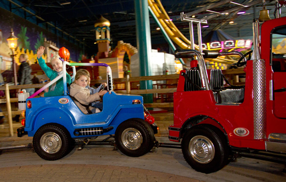 De minitrucks rijden achter elkaar een rondje door het Land van Toos. Een spannend avontuur voor de allerkleinsten.