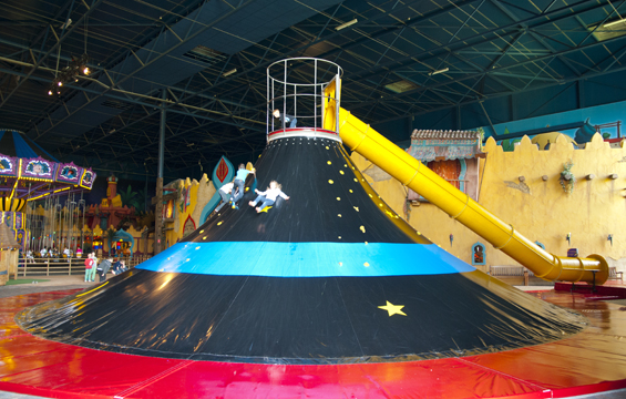Klim naar het topje van deze toverhoed en roetsj daarna voldaan naar beneden van de glijbaan.